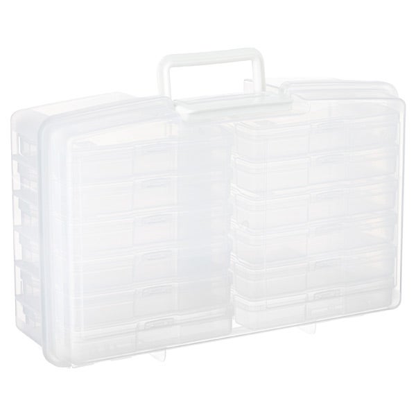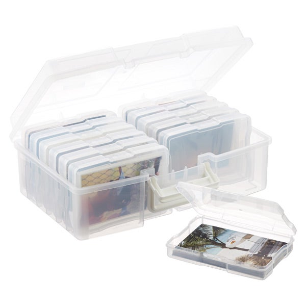 Organize your 4" x 6" photos or recipe cards with our 12-Case Photo Storage Carrier. It includes twelve inner cases that are easily transportable, fitting easily inside a purse or briefcase. Each acid-free inner case can accommodate approximately 100 photos and has a hinged lid that can be labeled by category or event for easy identification.